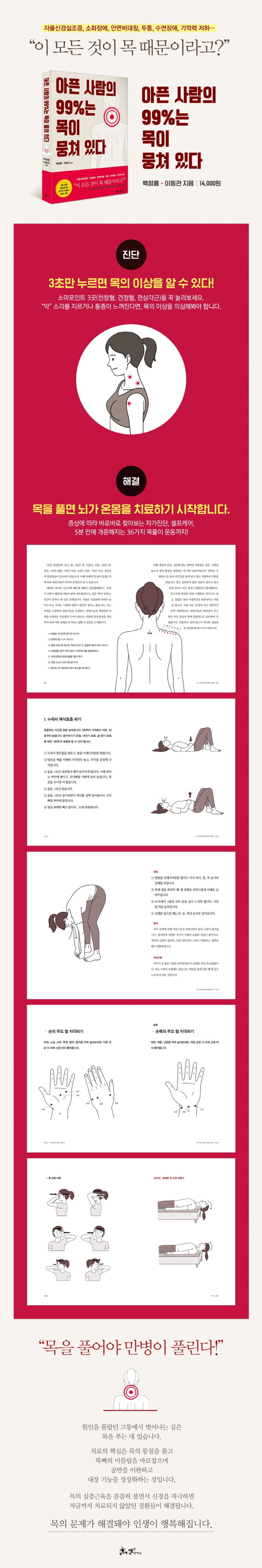 이 책은 15년간 15만 명을 진료한 노하우를 담아, 누구나 실천할 수 있는 36가지 목풀이 운동법과 20가지 혈자리 지압법을 소개합니다.