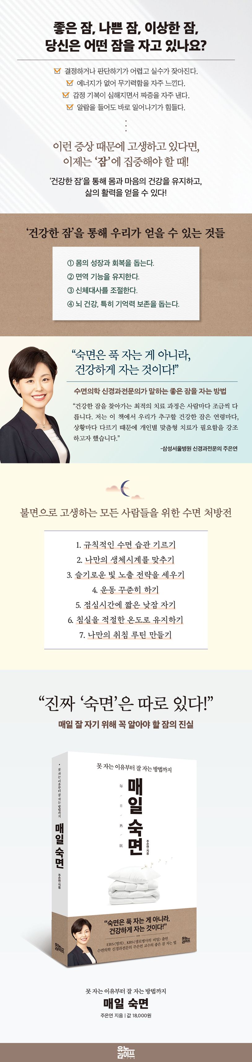 수면은 휴식이 아닙니다. 우리의 몸과 마음, 뇌와 면역, 감정과 행동까지 영향을 미치는 핵심적인 생명 활동입니다. 《매일 숙면》은 바로 이 중요한 수면에 대해 다루는 책입니다. KBS〈생로병사의 비밀〉, EBS〈명의〉 등에 출연했던 저자가 20년 이상 수면장애 환자들을 치료한 임상 경험을 바탕으로 쓴 책이기에 신뢰도가 높습니다.