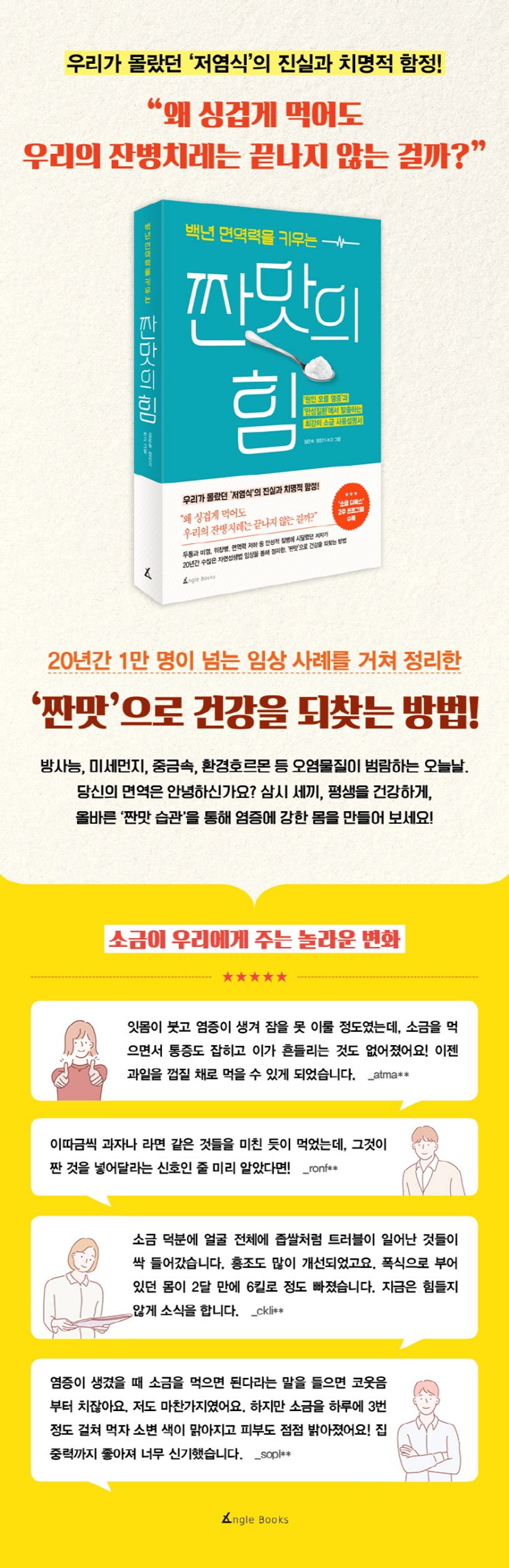 이 말이 절대 틀린 것은 아닐지 몰라도, 그 기준이 모든 사람에게 똑같이 적용될 수는 없습니다. 《백년 면역력을 키우는 짠맛의 힘》은 건강을 잃지 않기 위해서라도 ‘짠맛’을 다시 바라보자고 말합니다.