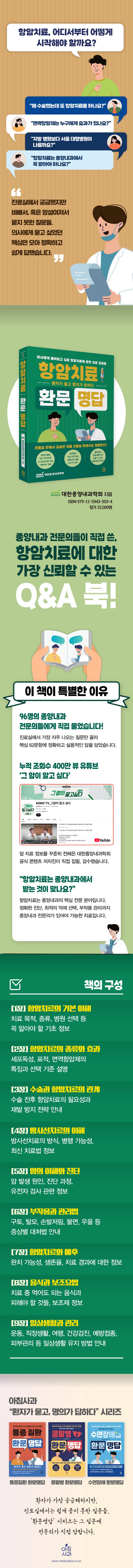 환자와 보호자가 묻고, 종양내과 명의들이 직접 답하는 이 책은, 진정한 ‘환자의 책’이라고 말할 수 있습니다. 암이라는 커다란 싸움 앞에서, 스스로 선택하고 주체적으로 살아가고자 하는 분들께 이 책을 진심으로 추천드립니다.