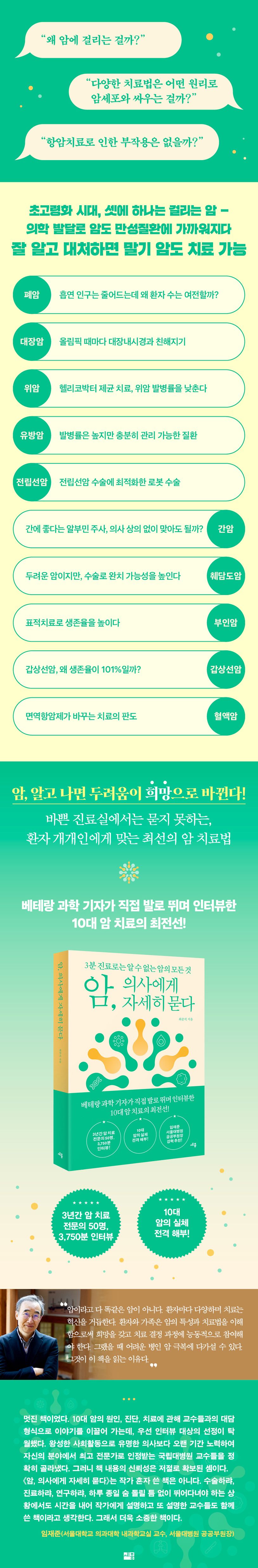 《암, 의사에게 자세히 묻다》는 과학 칼럼니스트 최준석이 전국 병원 현장을 발로 뛰며 암 전문의 50명과 3,750분간 인터뷰한 결과물입니다. 그동안 묻지 못했던 질문, 설명을 제대로 들을 시간조차 없었던 암에 대해 이 책은 대중의 언어로 차근차근 풀어냅니다.