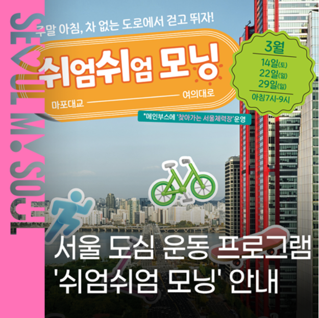 서울 여의도에서 열리는 ‘쉬엄쉬엄 모닝’ 행사! 여의도공원부터 마포대교까지 5km 도로를 시민에게 개방해 걷기·러닝·자전거를 자유롭게 즐길 수 있는 서울 주말 운동 프로그램 일정과 참여 방법을 정리해보았다.