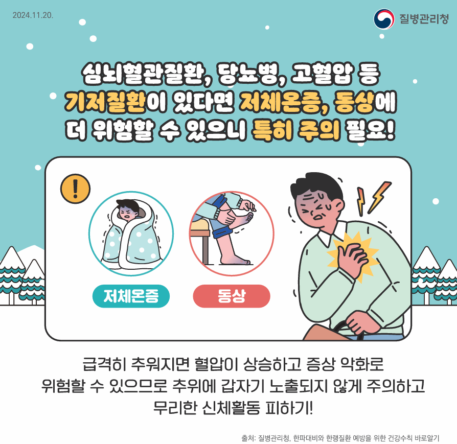 ▼ 침묵의 살인자 고혈압, 겨울철 관리가 중요한 이유 ▼ 고혈압 예방법급격한 기온 변화로 심뇌혈관질환 위험성이 높아진다고?기온 변화에 따라 심뇌혈관질환의 위험성이 증가하고 있습니다.